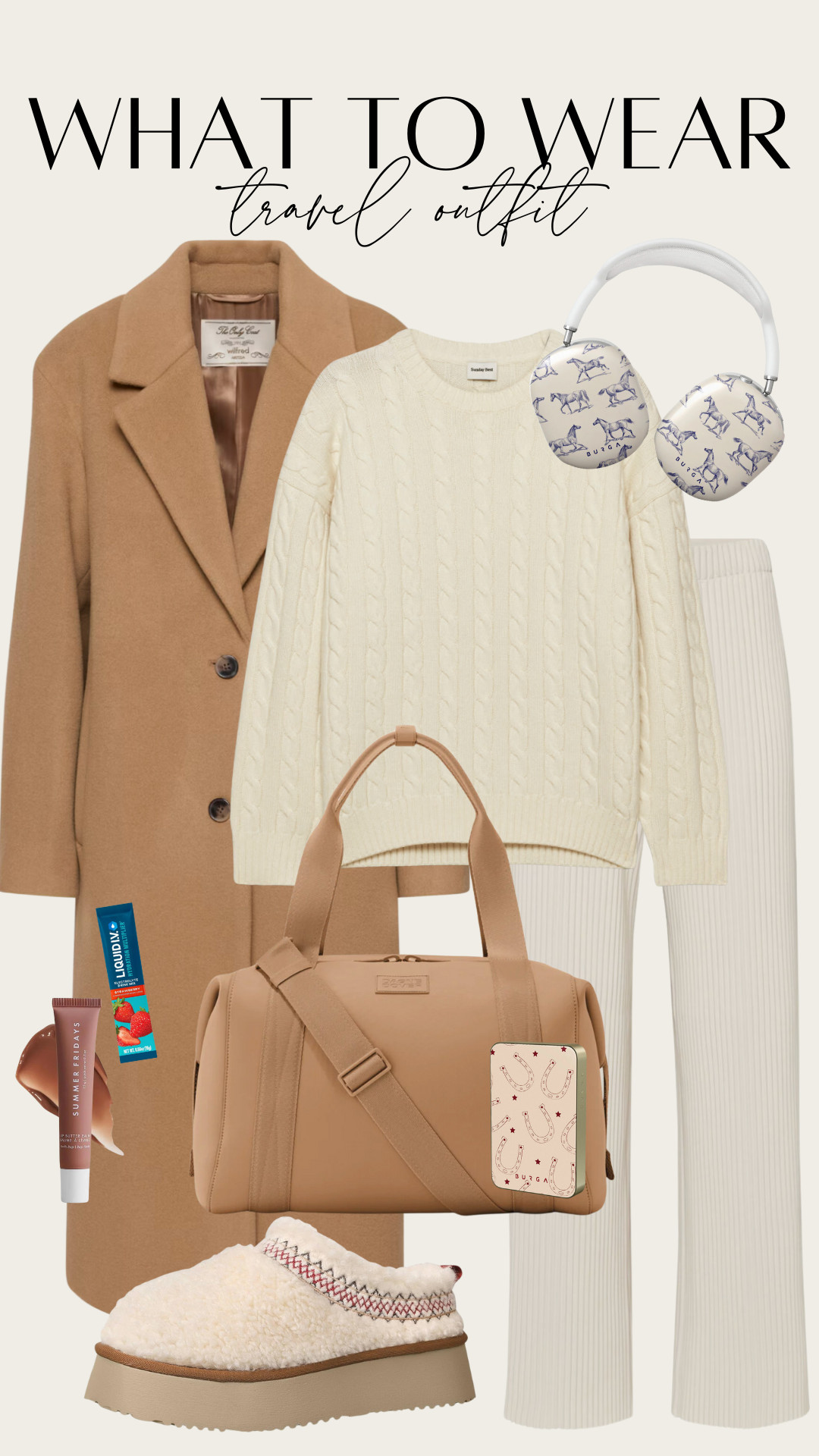 Stay comfortable yet polished for your travel day with a cozy neutral outfit. Don’t forget your weekender bag for all your essentials and wireless headphones!