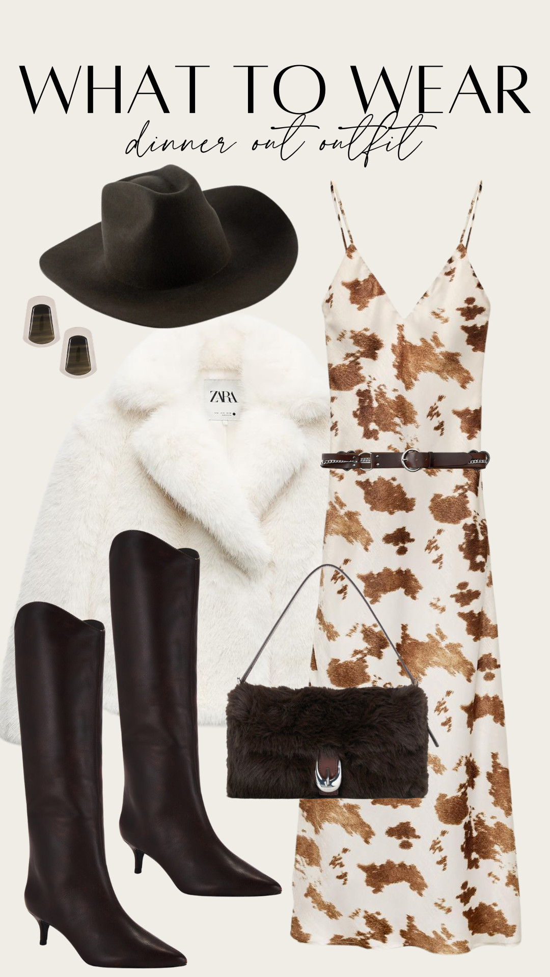 Chic, mountain-town glam meets western-inspired style. This cow print dress paired with faux fur is such a fun look. Finish it off with killer knee high boots and a cowboy hat.