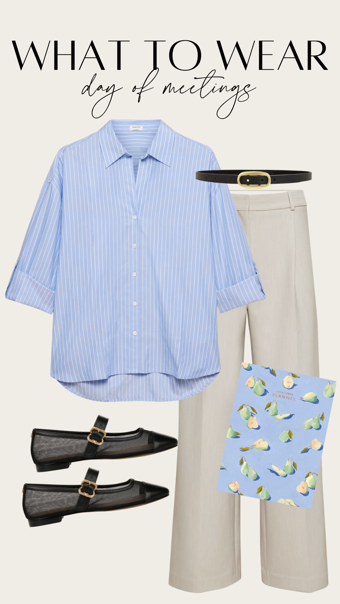 Look: Button-down shirt, tailored trousers, structured flats, and a planner that doubles as a statement piece. It’s giving “professional, but still me.”